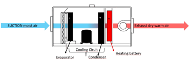 Warm, moist air is passed over a cold evaporator, where it cools below the dew point. The dry air is then reheated and blown back into the pool area..