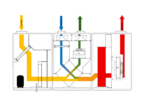 Warm, moist air is mixed with fresh outside air. The air is dehumidified, the heat from the pool area is recovered, and then the dry, warm air is blown back into the pool area..