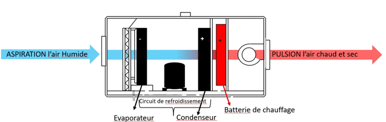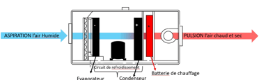 De l'air chaud et humide est acheminé vers un évaporateur froid où il se refroidit en dessous du point de rosée. L'air sec est ensuite réchauffé et insufflé dans la zone de la piscine..
