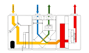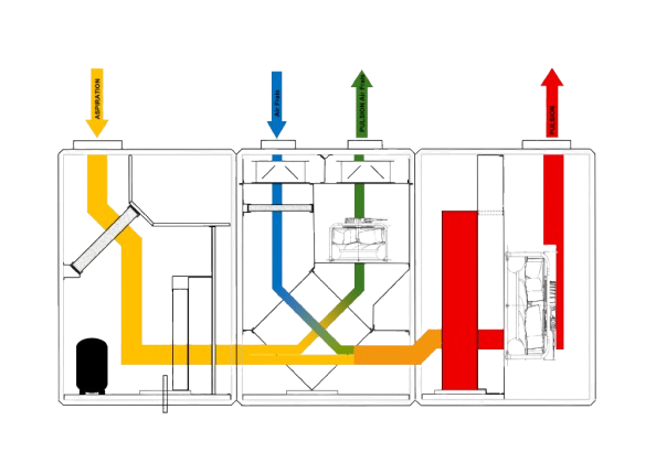 De l'air chaud et humide est mélangé à de l'air frais extérieur. L'air est déshumidifié, la chaleur de la piscine est récupérée, puis l'air chaud et sec est insufflé dans la zone de la piscine..